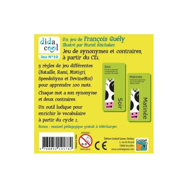 Idéal pour les CE1 et CE2, voici 5 règles différentes (Bataille, Rami, Mistigri, SpeedoSyno et DevineMoi) pour apprendre 200 mots. Chaque mot, en plus de sa définition, a son synonyme et deux contraires. Par exemple : Ami → Allié, Ennemi, Adversaire.