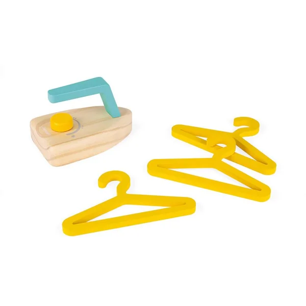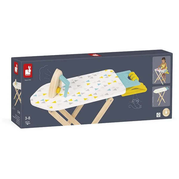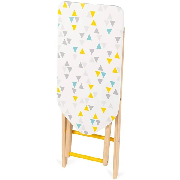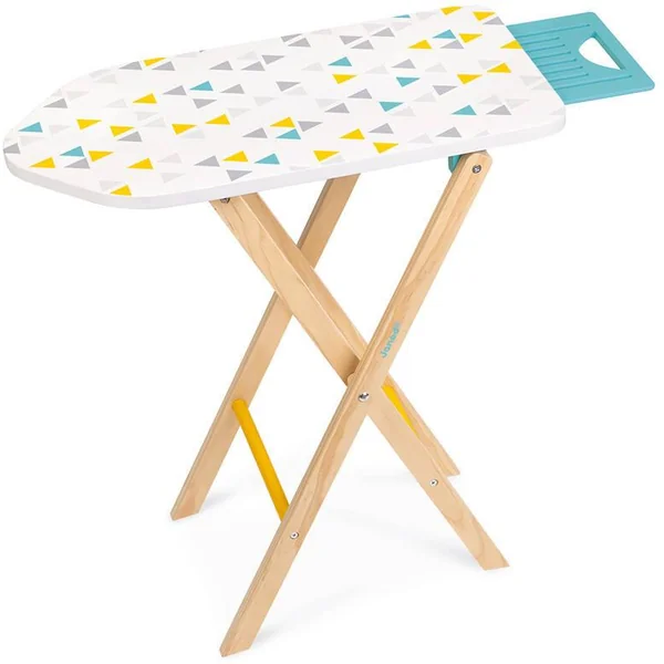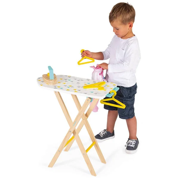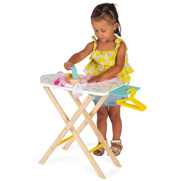 Jolie table à repasser, aux couleurs mixtes, idéale pour défroisser les vêtements des poupons. Hauteur réglable pour s’adapter à la taille de l’enfant (49,5 et 55,5 cm). Livrée avec 1 fer à repasser (bouton bruiteur) et 3 cintres. Pour enfants de 3 à 8 ans. Jouet en bois.