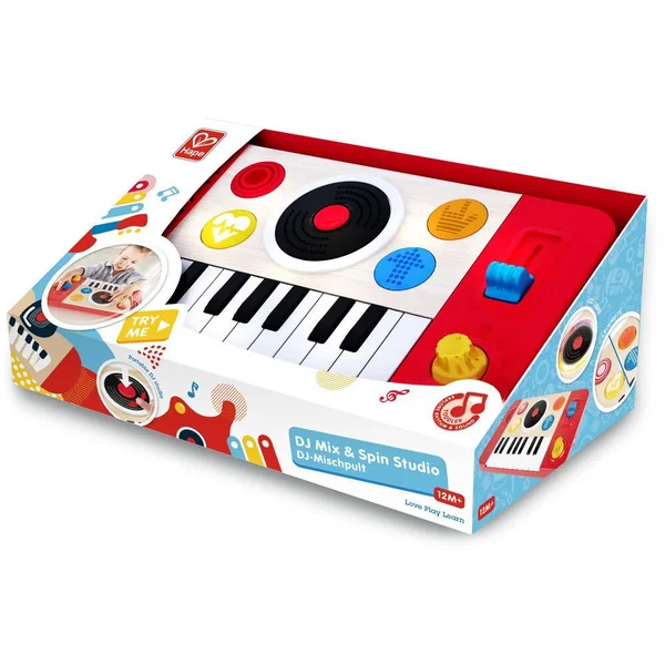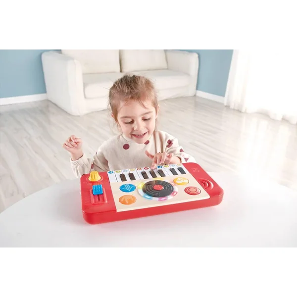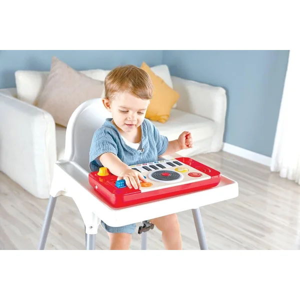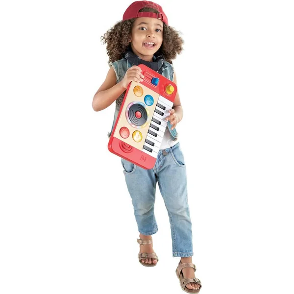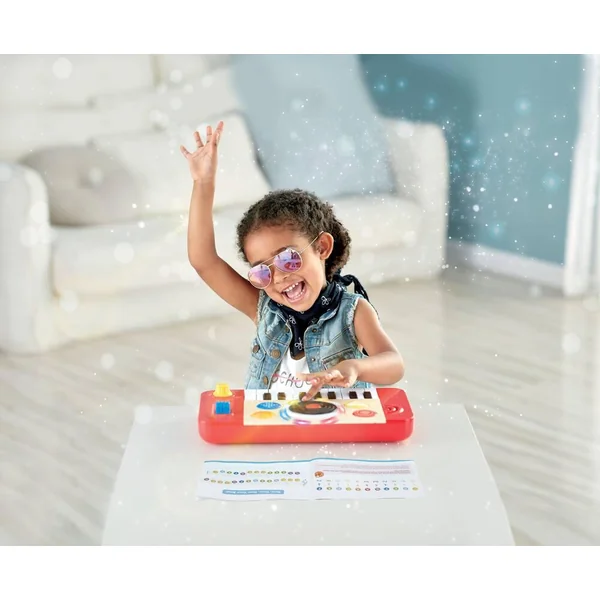 Vos enfants joueront leurs premiers morceaux grâce à cette table de DJ portable ! Jouez du clavier en solo avec les quatre sons d’instruments et les 18 effets sonores ludiques. Lancez une des cinq mélodies de fond, utilisez le curseur de tempo pour changer la vitesse, ajoutez des effets sonores de DJ ou scratchez avec le disque noir !