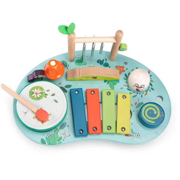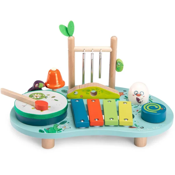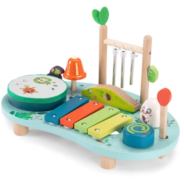 Table musicale en bois aux couleurs de la jungle. Avec la baguette, bébé pourra taper sur la mare tambour, frotter le dos du croco, jouer avec le métallophone coloré, s’amuser avec l’oeuf maracas et même faire tinter le bec du toucan contre la clochette !