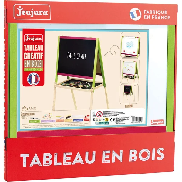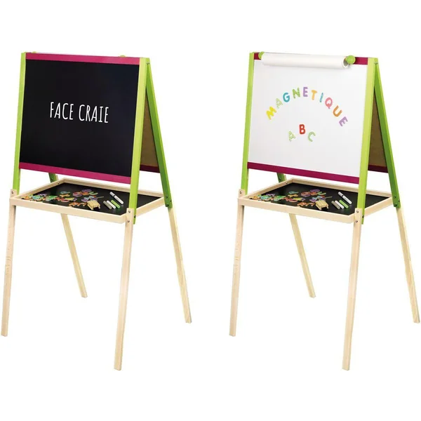 Tableau Créatif en Bois avec fonction Dessin : Deux ardoises : une ardoise pour écrire à la craie, une ardoise blanche magnétique pour feutre effacable à sec et lettres aimantées. Tablette de rangement. Accessoires : 50 lettres aimantées en bois, boîte de 3 craies, brosse à tableau en bois, feutre effacable à sec, rouleau de papier et 2 magnets. Dimensions du tableau : ardoises 56 x 43 cm – hauteur 105 cm. A partir de 3 ans.