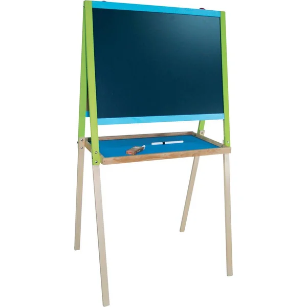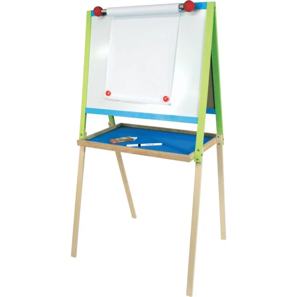 Tableau dessin en bois « deux ardoises » : une ardoise noire pour écrire à la craie, une ardoise blanche magnétique pour feutre effaçable à sec avec fonction dessin. Accessoires : rouleau de papier, boîte de 3 craies et feutre effaçable à sec ht : 105 cm – ard. 56 x 43 cm.