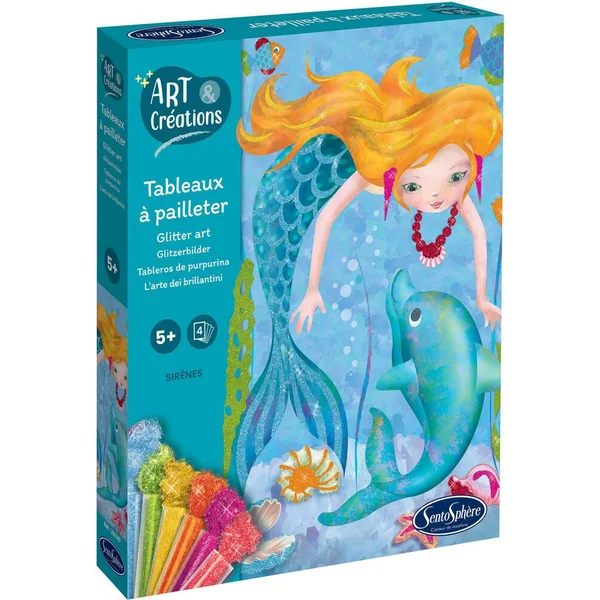 Découvrez l’univers aquatique et scintillant des sirènes grâce à ces tableaux à pailleter ! Grâce aux différentes couleurs de paillettes fournies, ajouter de l’éclat à leurs chevelures et à leurs queues de poisson ! A l’aide des tubes de paillettes et d’illustrations prédécoupées et préencollées, les enfants pourront facilement donner vie à de magnifiques tableaux, sans se salir ! Il leur suffira d’agrémenter différents détails de l’illustration en suivant quelques étapes : Décoller la pellicule de la zone que vous souhaitez colorer. Verser des paillettes dessus. Utiliser le pinceau pour bien répartir les paillettes sur toute la forme dévoilée. Admirer le résultat et recommencer avec une nouvelle zone et une nouvelle couleur ! Cette activité manuelle est aussi magique qu’impressionnante et offre un résultat garanti qui encouragera les enfants dans la création ! Boîte en carton à plus de 80% recyclé.