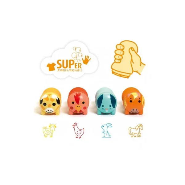 Le coffret comprend 4 tampons ergonomiques auto-encreurs: vache = jaune, poule = rouge, lapin = bleu et cheval = orange.