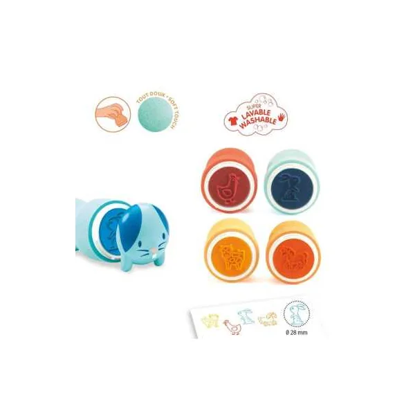 Découvrez les tampons animaux de la ferme de Djeco, 4 tampons pour les enfants à partir de 18 mois. Des tampons ergonomiques et auto-encreurs avec une poignée en mousse spécialement adaptés pour les petites mains. Votre enfant va pouvoir tamponner des poules, des lapins, des vaches et des chevaux sur ses cahiers ou ses feuilles de dessin.