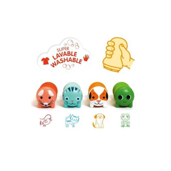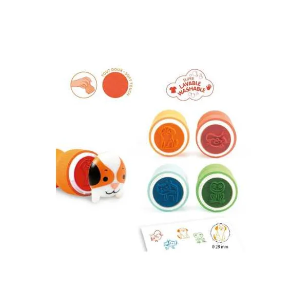 Le coffret comprend 4 tampons ergonomiques auto-encreurs: grenouille = vert, chien = orange, souris = rose et chat = bleu.