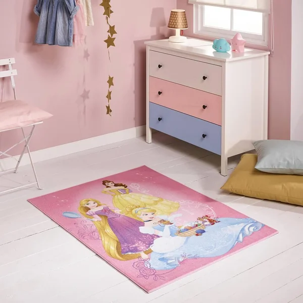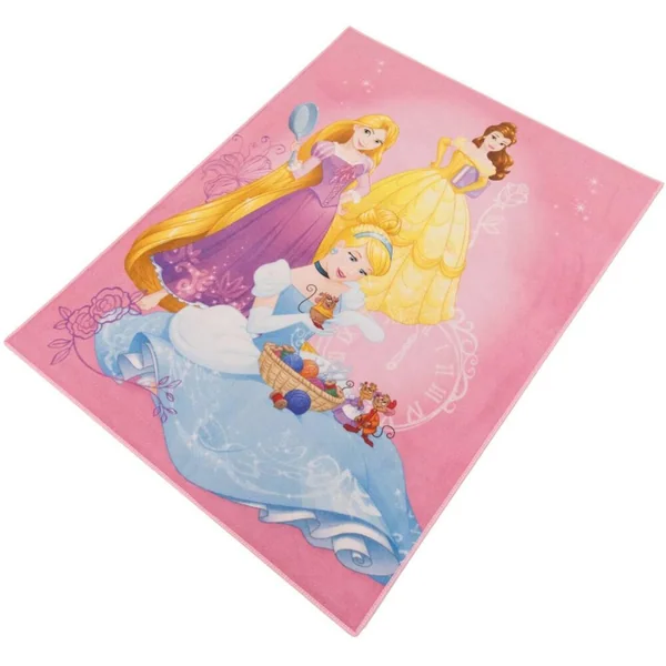 Tapis Princesses Disney avec Cendrillon, Raiponce et Belle. Imprimé numérique. Tapis tufté à velours bouclé rasé synthétique 100% polyamide (= nylon), avec un dossier mousse (gelfoam) antidérapant. Qualité standard, poids brut 1.32 kg/m2. Nettoyer toute trace à l’aide d’une éponge humide et de détergent doux. Ce produit n’est pas un jouet.