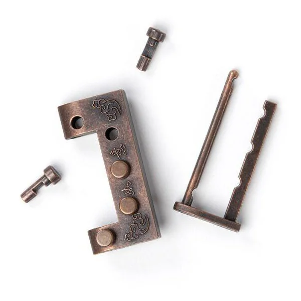 Une véritable serrure en bronze d’alchimiste. Utilisez les goupilles et votre intelligence pour la déverrouiller. Mais n’oubliez pas :