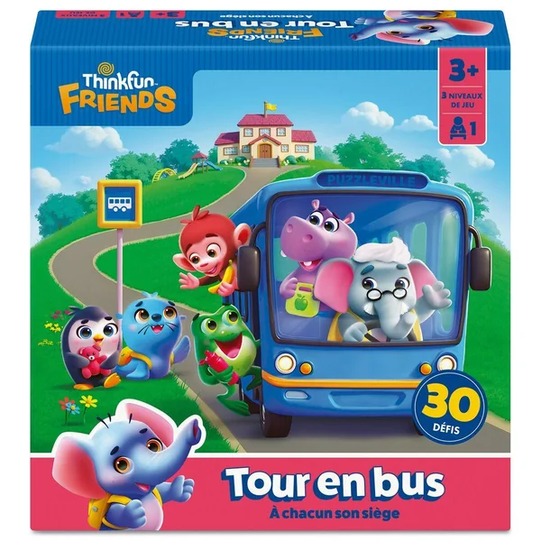 Montez à bord ! ThinkFun Friends : Bus Ride enseigne aux enfants d’âge préscolaire des notions simples de logique et des indices de position afin d’aider chaque ami à trouver la place qui lui convient dans le bus. Aider Évan Éléphant à trouver une place à chacun de ses amis dans le bus. Pour jouer, glissez une fiche défis dans le bus puis placez les amis déjà présents. Maintenant vous devez, à l’aide des indices, réussir à placer les autres amis. Parviendrez-vous à résoudre les 30 défis ? Ce jeu va permettre aux enfants d’améliorer leur persévérance lorsqu’ils ne trouveront pas la solution immédiatement.