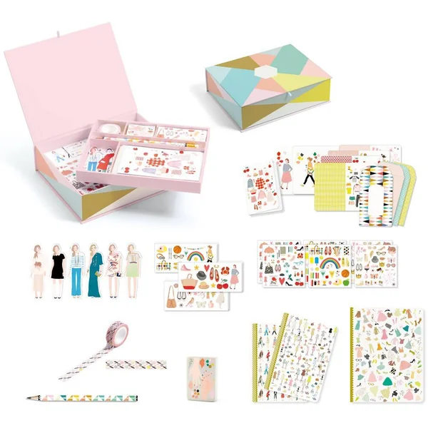 Contenu du coffret : des cartes et enveloppes, des stickers, des décalcos, 6 marques pages, des petits carnets à lignes, un grand cahier à lignes, une gomme, un crayon, un ruban adhésif imprimé.