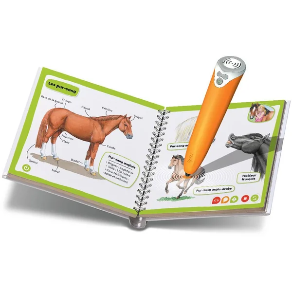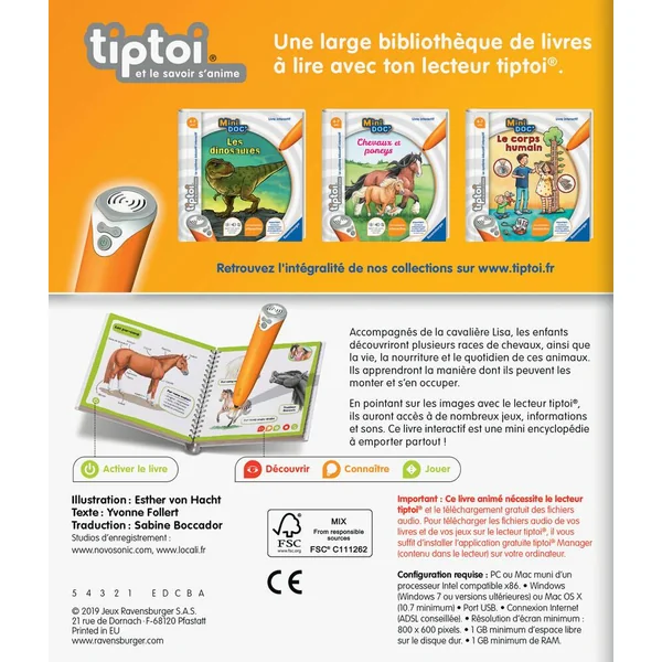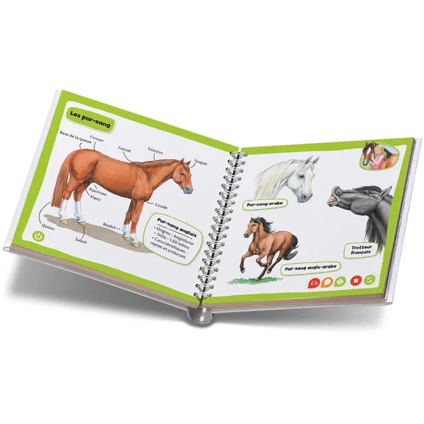 Accompagnée de la cavalière Lisa, les enfants découvriront plusieurs races de chevaux, ainsi que la vie, la nourriture et le quotidien de ces animaux. Ils apprendront la manière dont ils peuvent les monter et s’en occuper. En pointant sur les images avec le lecteur tiptoi®, ils auront accès à de nombreux jeux, textes informatifs et sons. Un livre interactif qui est une vraie mine de connaissances à emporter partout !