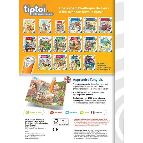 Avec tiptoi, l’enfant apprendra l’anglais tel qu’il se parle en Angleterre. Plus de 5000 mots de vocabulaire anglais et leur prononciation anime ce livre. Grâce aux jeux, apprendre l’anglais devient un vrai plaisir. Mon premier livre de vocabulaire anglais est un livre interactif accessible dès 6 ans. Fonctionne uniquement avec le lecteur tiptoi®, vendu séparément. tiptoi® est un lecteur éducatif interactif qui permet aux enfants de découvrir le monde de facon ludique et autonome. Lorsque l’enfant pointe le lecteur sur une image ou un texte, il entend des sons, des informations, des personnages ou de la musique. tiptoi® apporte une dimension nouvelle au contenu pédagogique des supports : que ce soit dans les livres, les jeux ou le globe, l’enfant n’a qu’à pointer le lecteur dessus et tout s’anime comme par magie ! La collection de livres interactifs tiptoi® Qui ? Pourquoi ? Comment ? répond de manière adaptée aux questions essentielles des enfants. Les informations factuelles sont expliquées en fonction de l’âge des enfants et validées par des spécialistes. Ce produit est composé de matériaux issus de forêts bien gérées certifiées FSC®, de matériaux recyclés et de matériaux issus d’autres sources contrôlées (FSC-C111262).