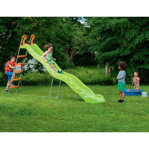 Toboggan VALOU de 3,80 m de glisse, glissière injectée en France verte , structure métal diamètre 30 mm coloris gris, arrivée en pente douce au niveau du sol. échelons antidérapants pour un accès sûr. Mains courante plastiques coloris orange. Barre stabilisatrice + piquets d’ancrage. Traitement anti-UV des plastiques. 3-12 ans – Poids maxi. supporté : 50 kg.