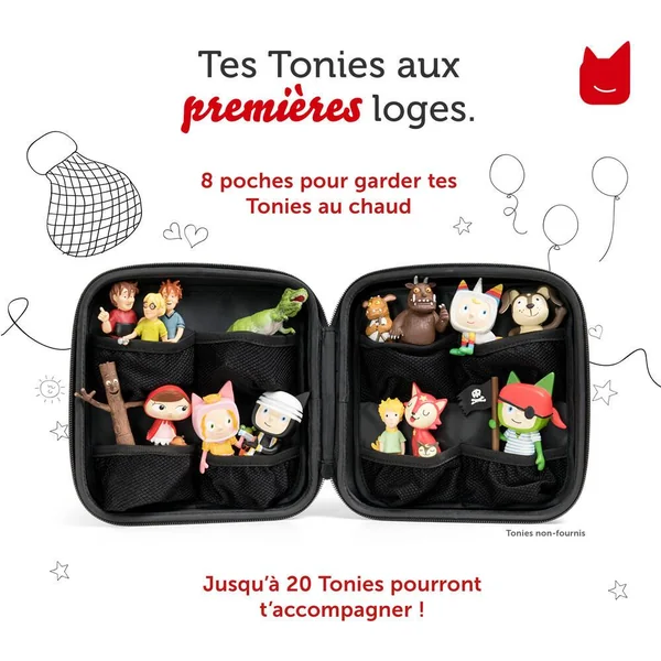 Grâce à la mallette de transport TONIES®-Balade, votre enfant peut emmener sa collection de figurines TONIES®s partout avec lui ! Dotée de 8 poches intérieures élastiques en filet, elle peut accueillir jusqu’à 20 figurines. Sa coque semi-rigide, rappelant le design de la TONIES®box, s’accompagne d’un zip qui arbore fièrement ses petites oreilles.