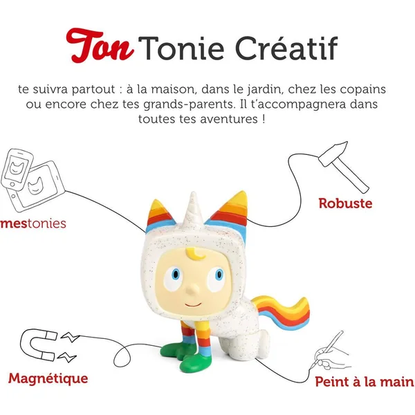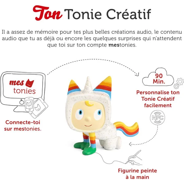 Figurines attachantes et hautes en couleur, les TONIES®s Créatifs ont le super-pouvoir de restituer jusqu’à 90 minutes de contenus de ton choix sur ta TONIES®box (vendue séparément). Des contenus qui peuvent être gérés directement depuis ton espace mes.TONIES®s.com et même créés de toute pièce grâce à la fonction Enregistrement de l’application gratuite mesTONIES®s, disponible sur smartphones et tablettes. Une histoire avec la voix de Papa ou la playlist préférée de Maman, il ne te reste plus qu’à choisir ta prochaine aventure !
