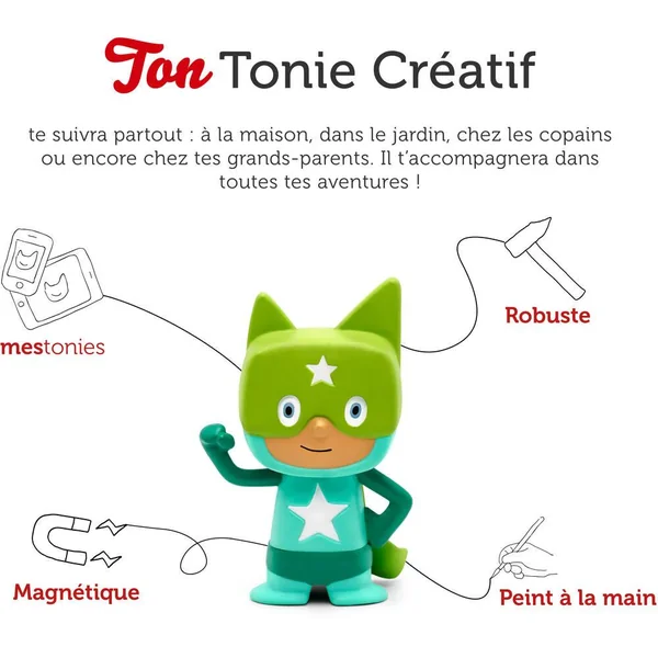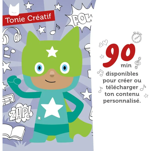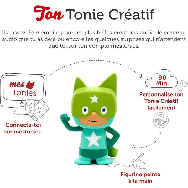 Figurines attachantes et hautes en couleur, les TONIES®s Créatifs ont le super-pouvoir de restituer jusqu’à 90 minutes de contenus de ton choix sur ta TONIES®box (vendue séparément). Des contenus qui peuvent être gérés directement depuis ton espace mes.TONIES®s.com et même créés de toute pièce grâce à la fonction Enregistrement de l’application gratuite mesTONIES®s, disponible sur smartphones et tablettes. Une histoire avec la voix de Papa ou la playlist préférée de Maman, il ne te reste plus qu’à choisir ta prochaine aventure !
