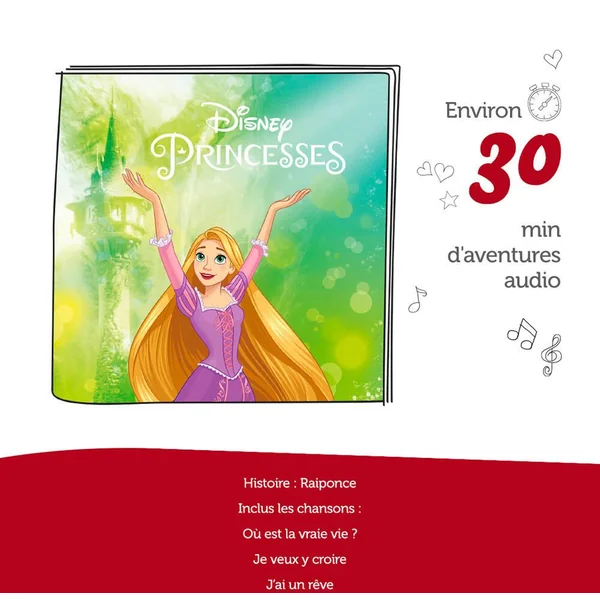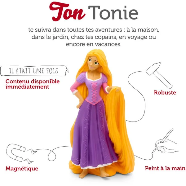 Avec votre figurine TONIES® Raiponce et votre TONIES®box (vendue séparément), embarquez pour une aventure audio unique (env. 30 min), inspirée de l’histoire originale du célèbre film de Disney et incluant les chansons les plus emblématiques (Où est la vraie vie ?, Je veux y croire ET J’ai un rêve). Et une fois l’aventure terminée, prolongez l’expérience de jeu dans le monde réel avec cette attachante figurine peinte à la main.