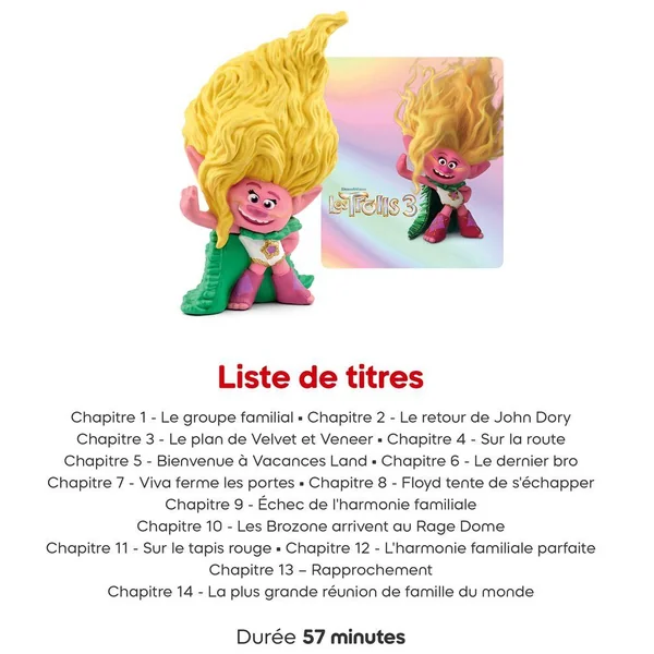 L’aventure musicale bien-aimée continue alors que les trolls découvrent une ancienne prophétie qui prédit l’arrivée d’un nouveau et puissant chef troll destiné à unir toutes les tribus trolls contre une menace commune. Entrez Viva, une jeune troll fougueuse et déterminée venue d’un pays lointain, avec un don extraordinaire pour exploiter le pouvoir de la nature à travers ses chansons enchanteresses. Lorsque Viva arrive au village des trolls, elle fait face à des défis et au scepticisme, mais prouve bientôt sa valeur en se lançant dans une quête palpitante pour protéger leur monde de la résurgence de l’ancien ennemi. Avec des mélodies entraînantes, des amitiés réconfortantes et un message d’unité, « Trolls Band Together » célèbre le pouvoir de la musique et de l’individualité tout en renforçant la force trouvée dans l’unité.