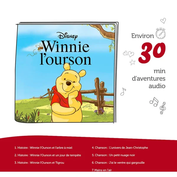 Retrouvez Winnie, l’ourson le plus gourmand de l’univers Disney, et son attachante bande d’amis dans 3 aventures légères qui font la part belle aux valeurs universelles que sont l’amitié, le courage ou encore la patience. L’aventure commence par une quête de miel à haut risque, se prolonge avec une tournée des amis qui décoiffe et se termine par une balade dans les bois qui ne se passe pas exactement comme prévue. Trois récits joliment complétés par 4 chansons issues de l’univers de l’ourson débonnaire.