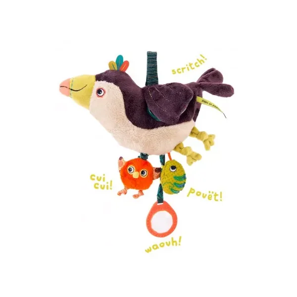 A suspendre à la poussette ou au parc, cette jolie peluche colorée cache sous l’une de ses ailes un miroir. Accompagné de ses amis le poussin et le caméléon, Pakou le toucan d’activités possède également un prisme et de nombreux autres gris-gris, qui amuseront bébé dès ses premiers mois.