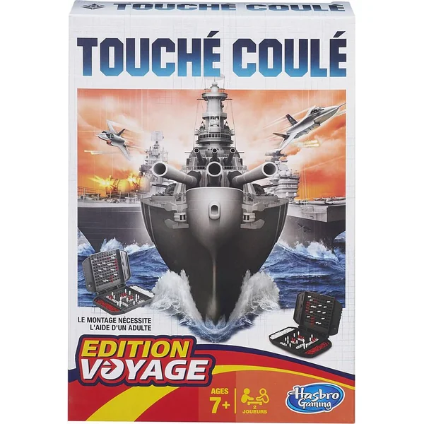 L’authentique jeu de la bataille navale : touchez, coulez, gagnez ! Format voyage. Inclut : 2 consoles de jeu, 10 navires, torpilles rouges, torpilles blanches et instructions. Pour 2 joueurs. Pas besoin de piles : système manuel. Règles du jeu incluses. Pratique tout se range dans deux petites mallettes en plastique. Prêts à plonger dans le vrai jeu de la bataille navale avec le célèbre jeu de société Touché-Coulé en format voyage ? Votre mission capitaine : détruire la flotte ennemie avant que tous vos vaisseaux ne soient coulés. Déployez votre flotte, planifiez vos attaques et tenez-vous prêt à faire feu ! Annoncez les coordonnées de vos tirs pour lancer vos torpilles. Les coordonnées se composent d’une lettre et d’un chiffre (par ex : E8). Le capitaine adverse doit alors vous indiquer si votre tir a touché un de ses vaisseaux. Si c’est touché, vous devez marquer le point de coordonnées d’une torpille rouge sur votre grille cible (partie basse de la console). Le joueur adverse fait de même sur sa grille océan (partie haute de la console). Si c’est manqué, c’est une torpille blanche qu’il faudra positionner au point de coordonnées. Un vaisseau est coulé lorsque tous les trous qui le composent contiennent une torpille rouge. Le capitaine dont le vaisseau a été coulé doit l’annoncer à son adversaire et retirer ce vaisseau de sa grille océan.