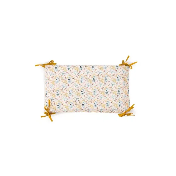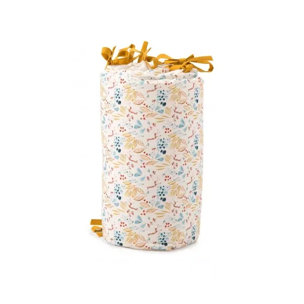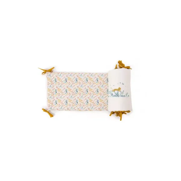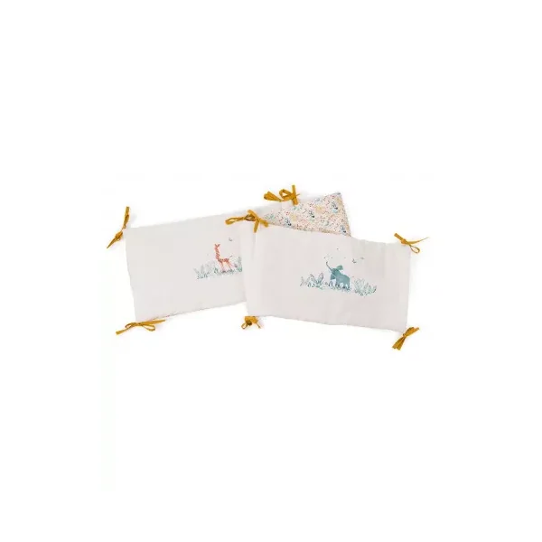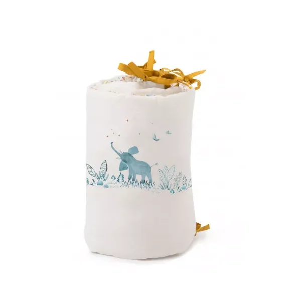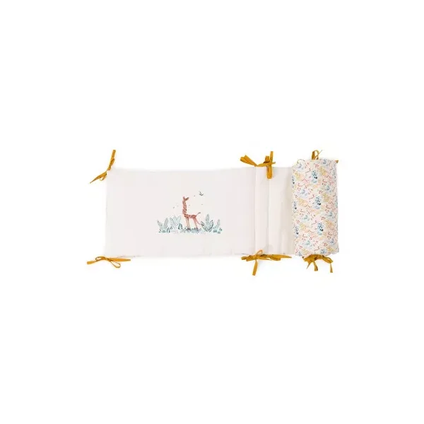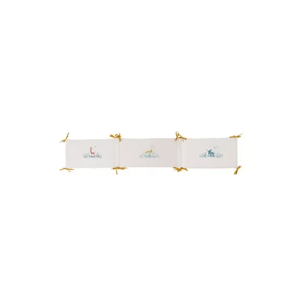 Découvrez le tour de lit crême de la collection Sous mon baobab de Moulin Roty, un tour de lit rembourré en lin lavé et coton très doux avec liens jaune ocre. Délicatement illustré des animaux de la collection girafe, éléphant et lion, il habille le lit pour entourer bébé de douceur et décorer sa chambre dans l’univers de la collection.