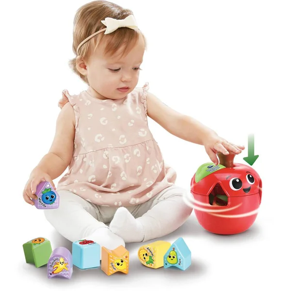 Une pomme pour apprendre les formes, les fruits et les couleurs ! Non électronique comprenant 90% de plastique réutilisé. Découvrez 10 formes à trier et à insérer dans les 4 ouvertures prévues à cet effet. Chaque forme correspond à un aliment et à une couleur. En appuyant sur le haut de la pomme, l’enfant fait tourner la partie haute et change ainsi la forme des ouvertures. Une trappe permet de récupérer les formes. Bébé développe sa motricité fine, sa coordination Main/Œil, sa logique et la résolution de problèmes.