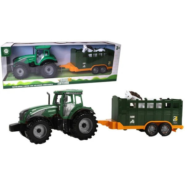 Tracteur vert 44 cm à friction avec remorque et animal.