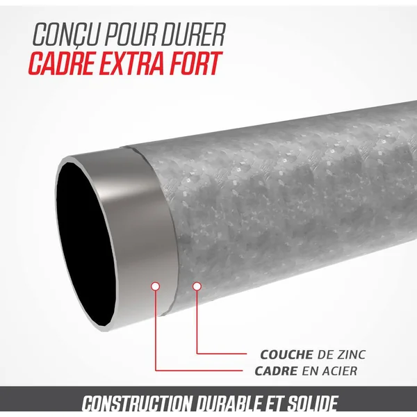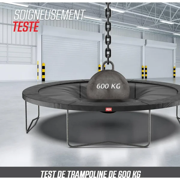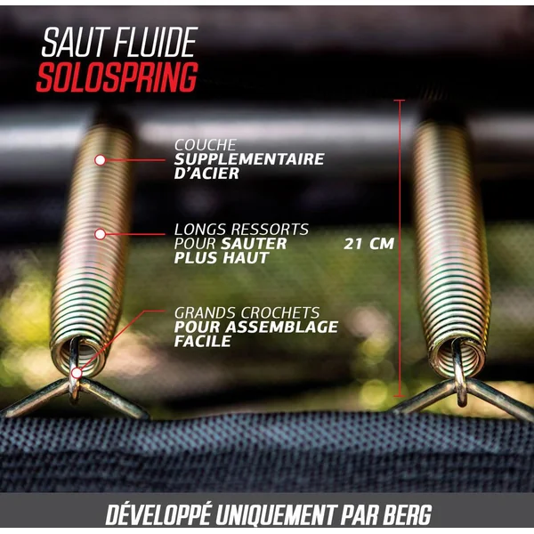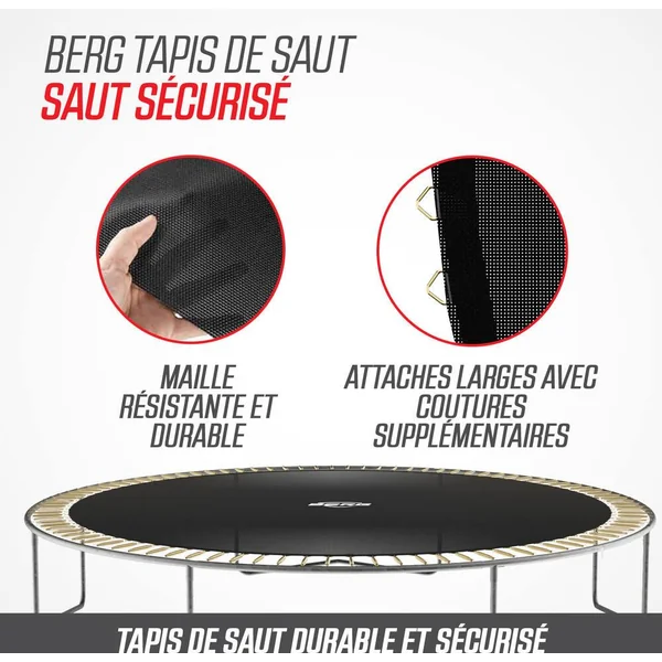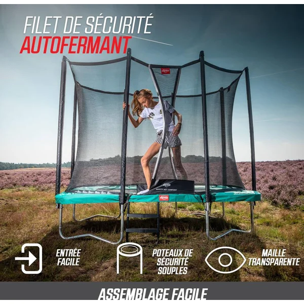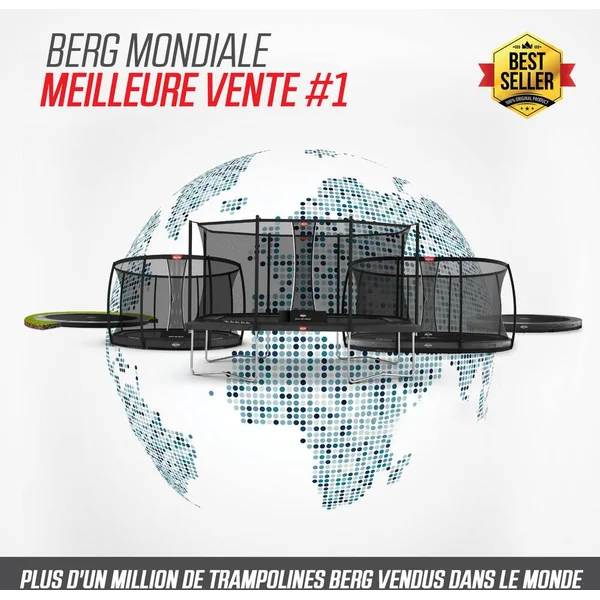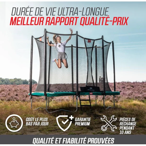peu d’entretien. Le BERG Favorit a été conçu avec beaucoup de soin et d’attention. Le résultat en vaut la peine; c’est un trampoline d’excellente qualité et très sûr. Un trampoline rond. Coussin de protection. Le tapis de saut. Les ressorts. Le cadre. Safety Net Comfort. Si vous ne voulez pas creuser de trou dans le jardin, il est