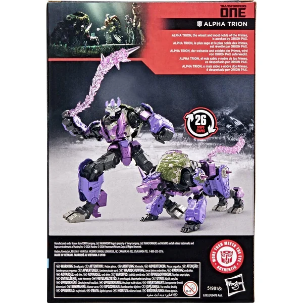 On peut facilement recréer l’action épique du film Transformers : Le Commencement avec la figurine Transformers Studio Series Alpha Trion ! La figurine de 16,5 cm se convertit du mode robot au mode animal lion cornu en 26 étapes. Avec des détails inspirés du film, une excellente articulation et une queue-fouet d’Energon en 6 pièces qui se fixe sur la figurine dans les deux modes, cette figurine Transformers Alpha Trion est un super ajout à toute collection. Il existe d’autres jouets de collection Transformers (vendus séparément, dans la limite des stocks) dont les personnages préférés de tous, Optimus Prime, Bumblebee, Megatron et bien d’autres, pour créer une collection de héros et de méchants plus forts que les apparences. TRANSFORMERS et HASBRO et toutes les marques et logos associés sont des marques de commerce de Hasbro, Inc.