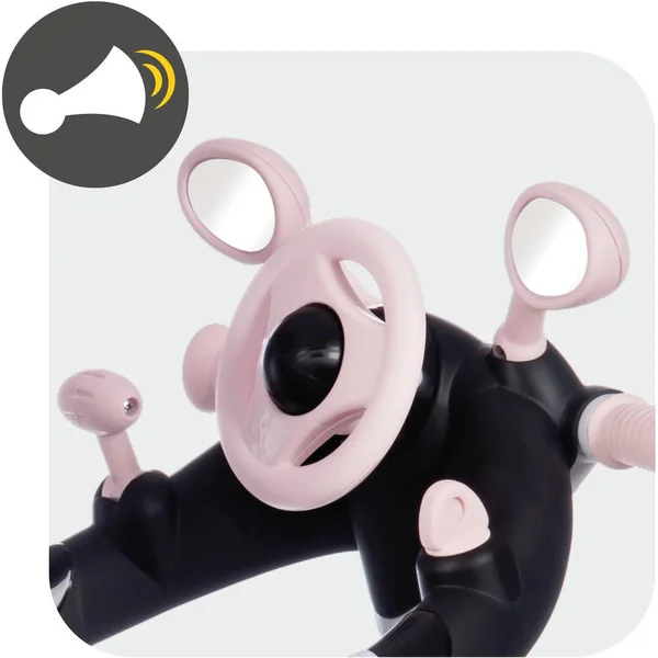 Canne directionnelle réglable (1m max) et amovible. Ombrelle orientable 360°. Porte-bilencieuses et increvables (EVA). Canne directionnelle réglable (1m max) et amovible. Ombrelle orientable 360°. Porte-bouteille. Dispositif de transfert de direction parent-enfant. Dispositif roue libre (débrayage des pédales). Benne basculante. Klaxon, rétroviseurs, volant et levier de vitesse.