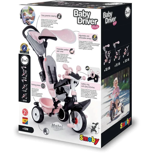 Le Baby Driver allie sécurité, confort et jeu. Ce nouveau modèle ‘Plus’ est encore plus rassurant et plus complet. Il est doté d’un frein de parking, très utile et surtout sécurisant, ainsi que d’un dossier plus haut pour un meilleur maintient. Ce modèle est conforme à la norme poussette EN1888-1. Évolutif de 10 mois à plus de 3 ans. Canne directionnelle intuitive : Une simple pression d’un côté ou de l’autre permet de faire tourner la roue avant. Frein de parking. Siège avec repose-tête et harnais de sécurité 5 points (transformable en simple ceinture). Housse rembourrée confortable, amovible et lavable. Repose-pieds ergonomique et rétractable. Sac amovible avec poignée. Crochet porte-sac à l’arrière de la canne parentale. Roues silencieuses et increvables (EVA).