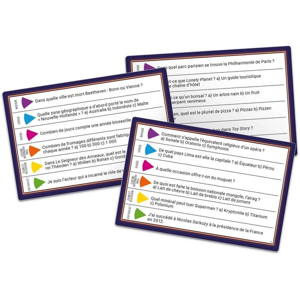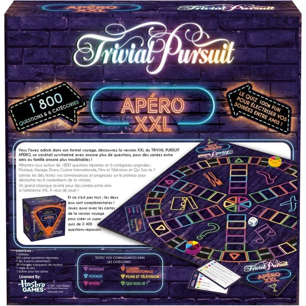 Testez vos connaissances dans cette édition unique et augmentée de Trivial Pursuit Apéro ! Choisissez parmi 1800 questions fun dans les catégories : Musique, Voyage, Divers, Cuisine, Films et Qui-suis-je ?