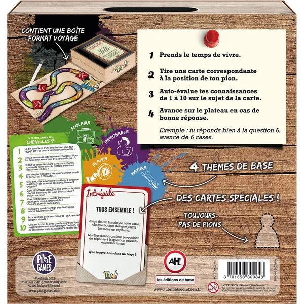 1 boite servant de plateau, 540 cartes, 1 règle du jeu, 1 boîte de voyage incluse, 4028 nouvelles questions et 1 boite voyage incluse.