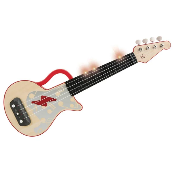 Ukulélé électrique rouge au style de guitare avec des effets lumineux et un mode d’apprentissage intégré. Suivez les lumières clignotantes pour jouer l’une des 5 mélodies incluses.