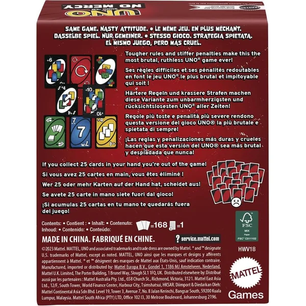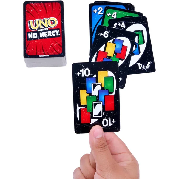 - Le jeu UNO No Mercy comprend 56 cartes supplémentaires, des règles spéciales et des cartes Action redoutables, ce qui en fait le jeu UNO le plus brutal qui soit !