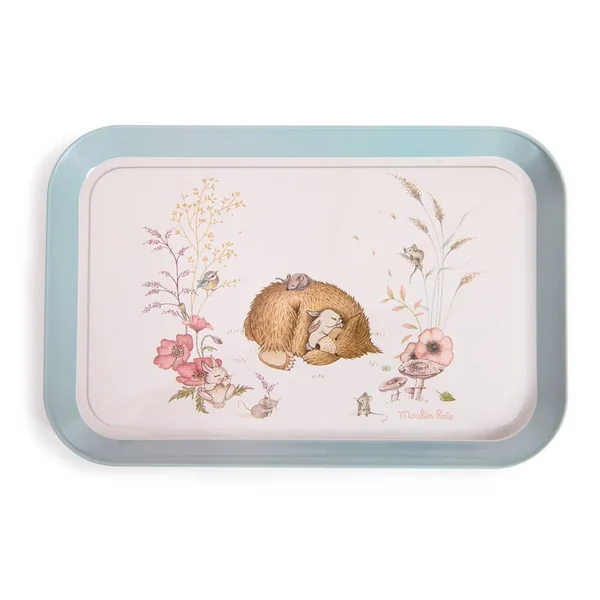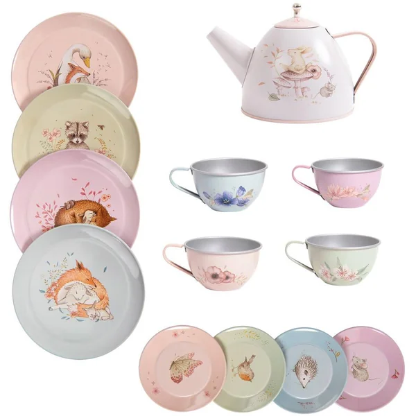 Valise service à thé en métal illustré des fleurs et animaux favoris de nos amies les Rosalie. Elle comprend un plateau, une théière, quatre assiettes à dessert, quatre tasses et leurs soucoupes assorties.