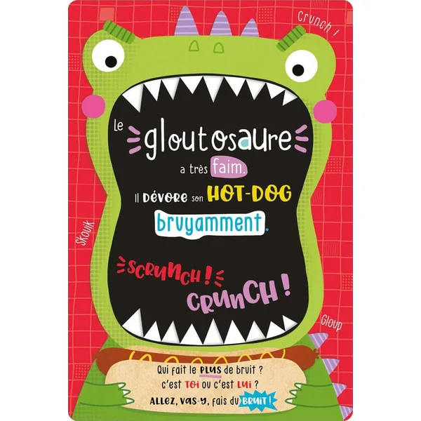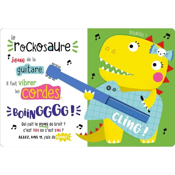 Dès qu’ils se réveillent, les dinosaures font du bruit. Beaucoup de bruit ! Un élastique qui claque, des billes qui crissent, un velcro qui scratch, des bulles à éclater, une fermeture éclair… Les enfants vont adorer faire du bruit en leur compagnie avant de fermer la bouche du ziposaure : Chut, plus de bruit, c’est l’heure d’aller se coucher !