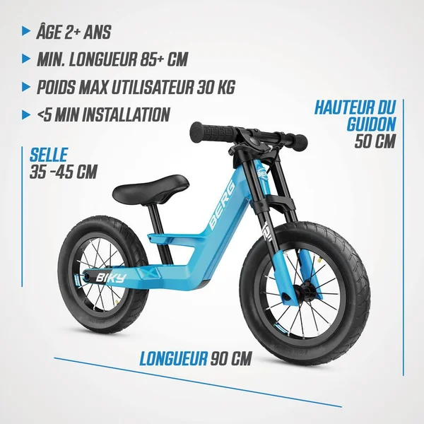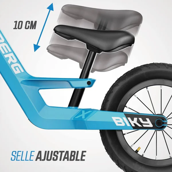 Plus de 35 ans d’expérience dans le développement de jeux de plein air – Utilisation de matériaux de haute qualité et adaptés aux enfants – Convient à un usage intérieur et extérieur. Le pouvoir de la légèreté – À l’aide des dernières techniques de production et du magnésium léger, BERG a pu développer un cadre exceptionnellement robuste avec un poids très faible. Ceci rend le vélo d’équilibre facile à manier, mais surtout très agréable à conduire. L’importance d’une ergonomie optimale – Avec son cou-de-pied bas et sa selle réglable en hauteur, il est facile de monter sur le Biky, adapté aux enfants de 85 cm à 115 cm. Le serrage de la selle est intégré à la structure et peut être facilement actionné à l’aide de la clé Allen incluse dans la livraison. La hauteur de la selle du Biky 10″ (Biky Mini) commence à 29,5 cm, et à 32 cm pour les Bikys 12″ (City, Cross et Retro). Les repose-pieds intégrés avec bande antidérapante permettent un équilibre sans effort !