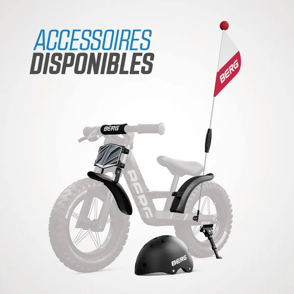 Avec les accessoires du Biky de BERG, conduire votre vélo d’équilibre n’est pas seulement plus amusant, mais aussi plus sûr ! Ainsi, vous pouvez protéger cette jolie tête avec un casque branché, et un drapeau permet d’être vu par les automobilistes. Un support de vélo permet de garer le Biky n’importe où. Et pour les cyclistes les plus endurcis, nous avons également prévu un support de guidon. Grâce à sa bandoulière ultra pratique, vous pouvez facilement emmener le vélo avec vous lors d’une promenade au parc ou en ville.