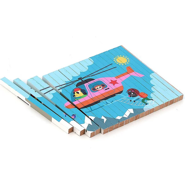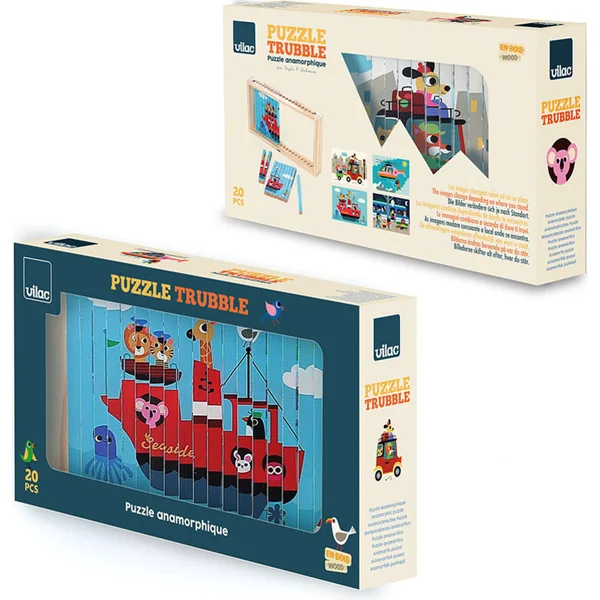 Ce puzzle en bois en quatre dimensions, magnifiquement illustré par Ingela P. Arrhenius, est le jouet idéal pour développer la pensée logique et les capacités d’observation des enfants. À l’aide de petites tiges en bois qui s’insèrent dans un cadre, l’enfant découvre quatre images différentes selon l’angle de vue.