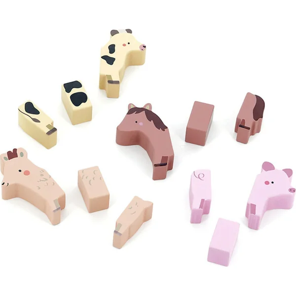 - 12 pièces, 4 animaux – une vache, un poney, un cochon, une chèvre