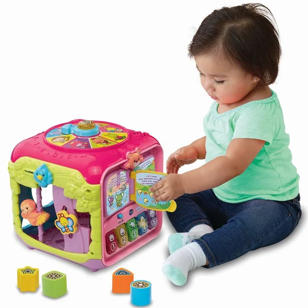 Super cube des découvertes rose. Un cube interactif avec 5 faces de jeu dont 2 faces électroniques ! 6 activités : – un livre interactif avec une page à tourner pour écouter des chansons amusantes, – 5 touches de piano lumineuses pour découvrir les chiffres, les couleurs, les animaux et écouter des mélodies, – une aiguille à faire tourner sur le cadran pour découvrir les animaux et des objets associés, – un trieur de formes avec 4 blocs colorés inclus, – des formes et des engrenages , – des animaux mobiles à manipuler. Bébé appuie sur le petit ourson pour déclencher des chansons. 10 mélodies et 4 chansons. Réglage du volume sonore et arrêt automatique. Pile de démonstration fournie