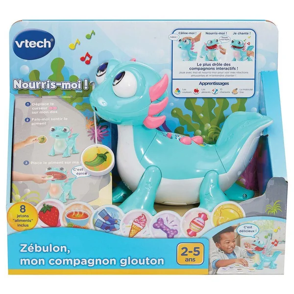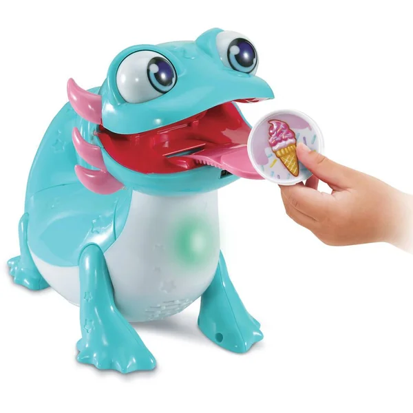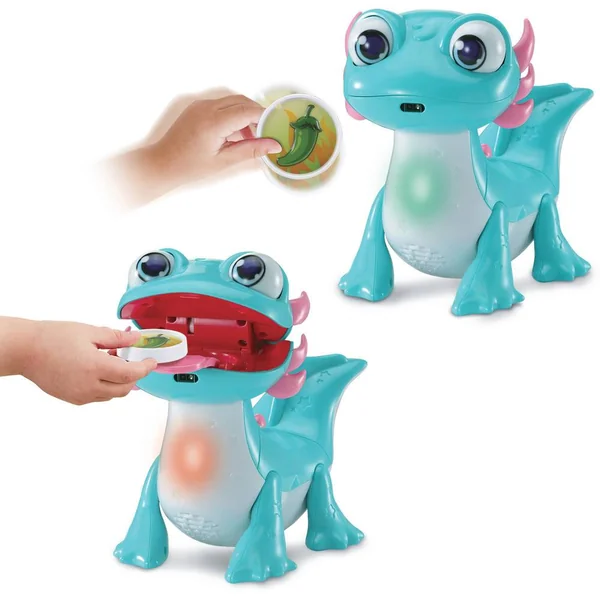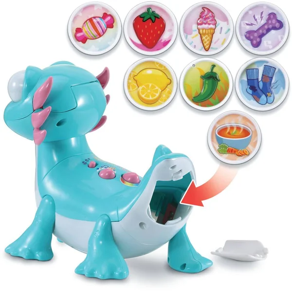Il reconnaît les 8 pièces de jeu incluses (bonbon, glace, fraise, citron, piment, soupe, os et chaussettes) et réagit de façon amusante en fonction de ses goûts.