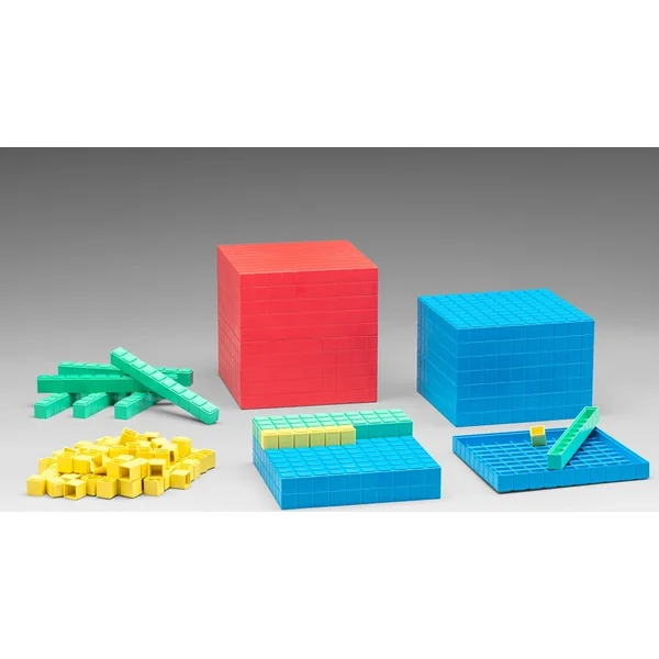 Le set comprend 100 cubes jaunes d’unités, 10 bâtons verts de dizaines, 10 carrés bleus de centaines et 1 cube rouge de mille, qui n’est pas empilable mais solide.