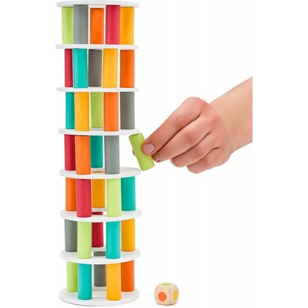 La tâche de l’enfant est de construire une tour avec des cylindres et des anneaux comme il le voit sur l’image. Ensuite, le jeu peut commencer. Chaque joueur tire à tour de rôle des cylindres de la tour de manière à ce que la tour reste intacte. Celui dont la tour tombe en premier perd. Le jeu est destiné à 2 joueurs, dont l’un peut être un parent et l’autre un enfant.