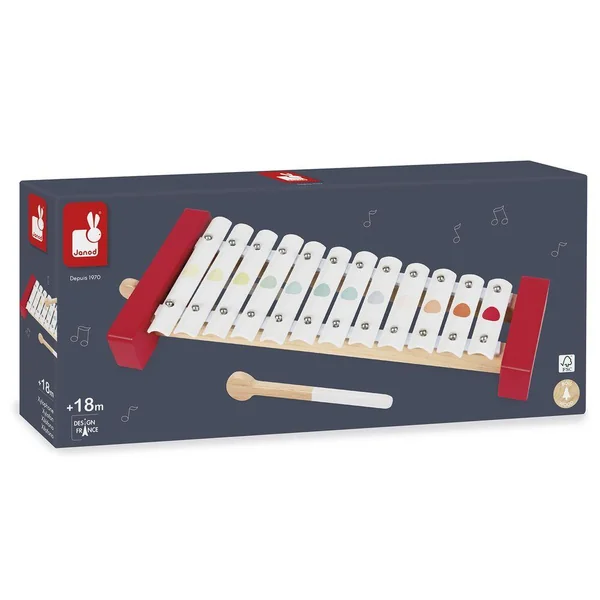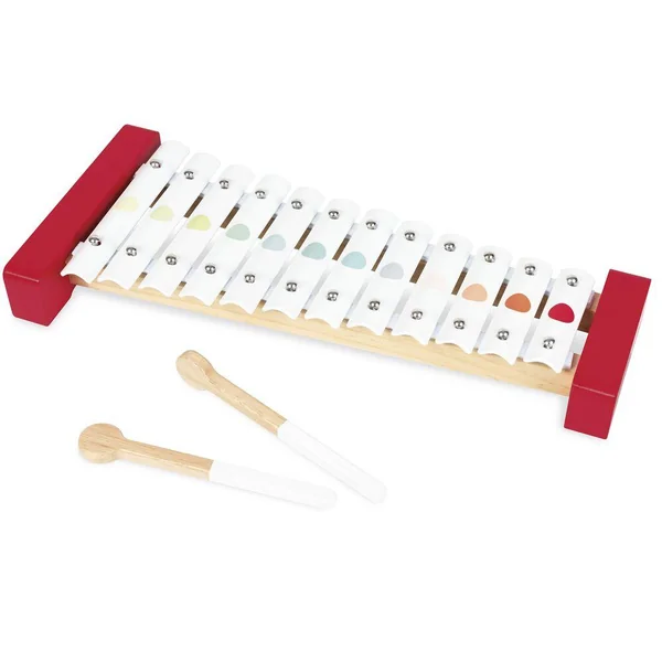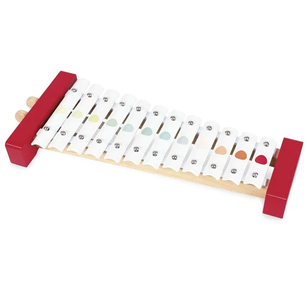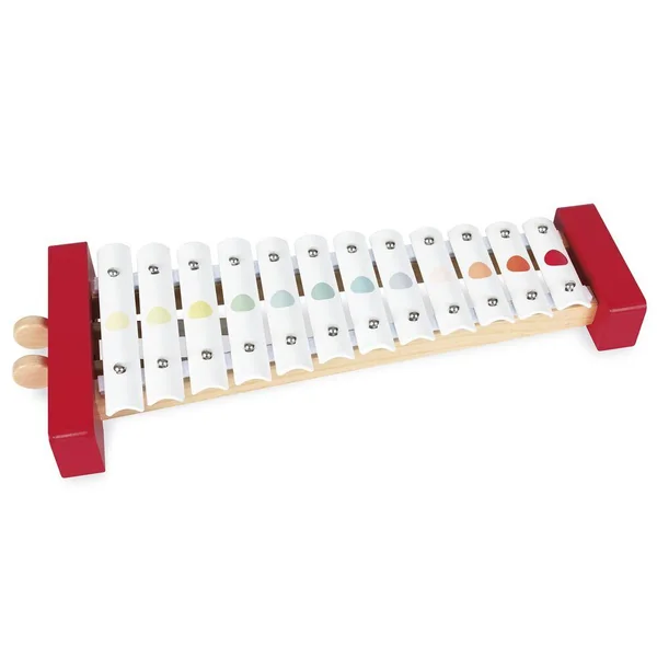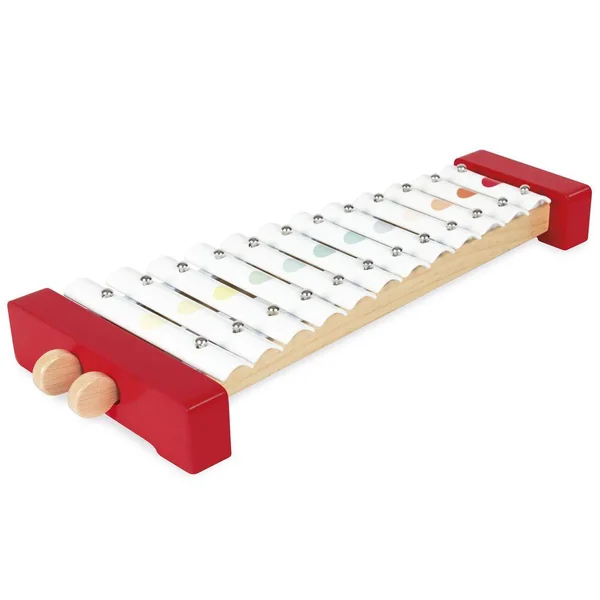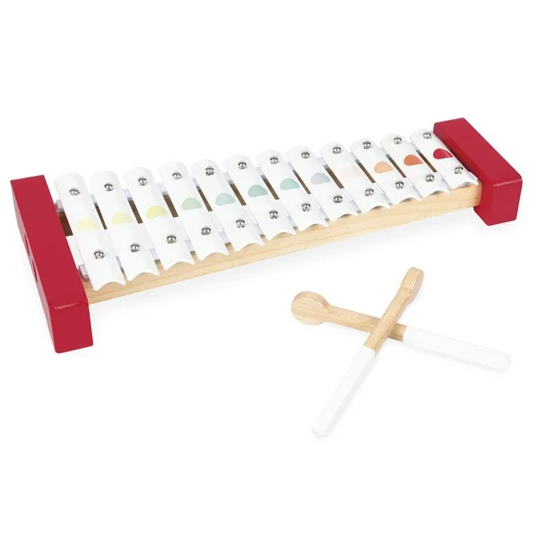 Xylophone en bois équipé de 12 lamelles en métal. Livré avec 2 baguettes. Rouge, jaune, vert, orange … !!! Confetti, c’est une gamme complète d’ instruments de musique avec des motifs Pop N’ Rock ! Confetti éveille tous les sens et permet aux plus jeunes musiciens de s’initier aux joies de l’improvisation musicale. Impression des pois par sérigraphie. Support en bois.