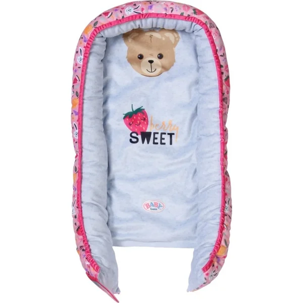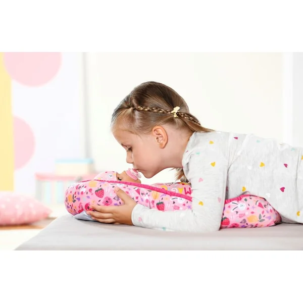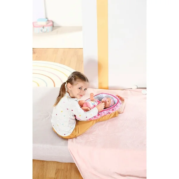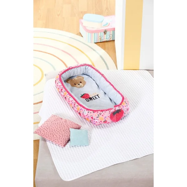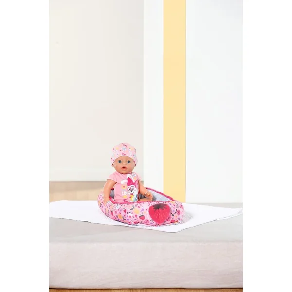 BABY born repose tranquillement dans son nid et profite du confort. Le nid coloré au design ludique avec des images de fruits et d’animaux a une ouverture fermable en bas, ce qui permet de sortir facilement BABY born du nid, de la remettre dedans et de jouer avec elle dans le nid.