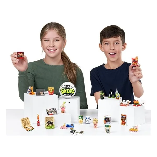 • Collectionnez différentes Mega Gross Minis et créez votre propre collection de hot-dogs dégoûtants, de frites pourries et bien plus encore.